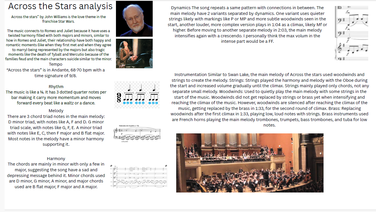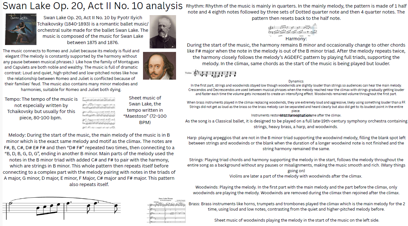 Swan Lake - The strings are mainly quiet and layered with multiple different instruments like violins and the song avoided quick change in chords, making it delicate and fancy than loud and heavy, fitting the tone of how Romeo and Juliet are both from powerful rich families.